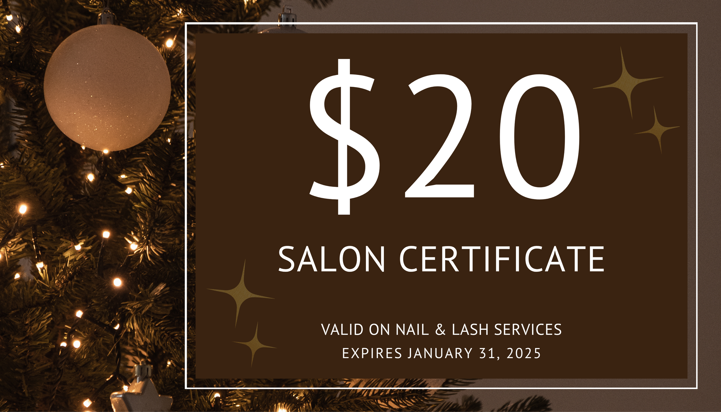For every $100 spent on gift cards, recieve an additional $20 salon certificate valid for nail and lash services.